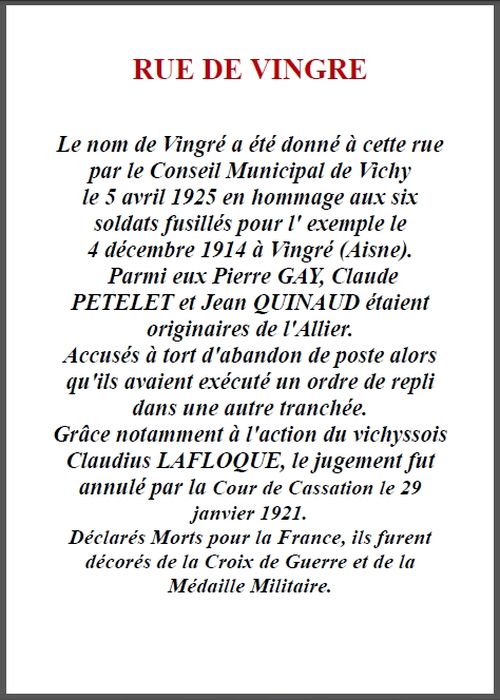 Le 15 avril 1925, le Conseil Municipal de Vichy accorde une subvention pour ériger un monument dans la commune de Vingré à la mémoire des martyrs (Vichy est la seule commune à avoir contribué à cette œuvre) et décide de substituer à Vichy le nom de rue de Vingré à celui de la rue de l'abattoir.