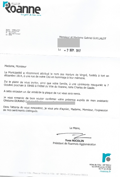 Voici cette lettre expédiée par la mairie de Roanne, datée du 17 août 2016, adressée à Madame et Monsieur Guillalot et diffusée avec leur aimable autorisation ainsi que celle de Monsieur Gérard Côtes, petit-fils de l'épouse de Jean Blanchard.