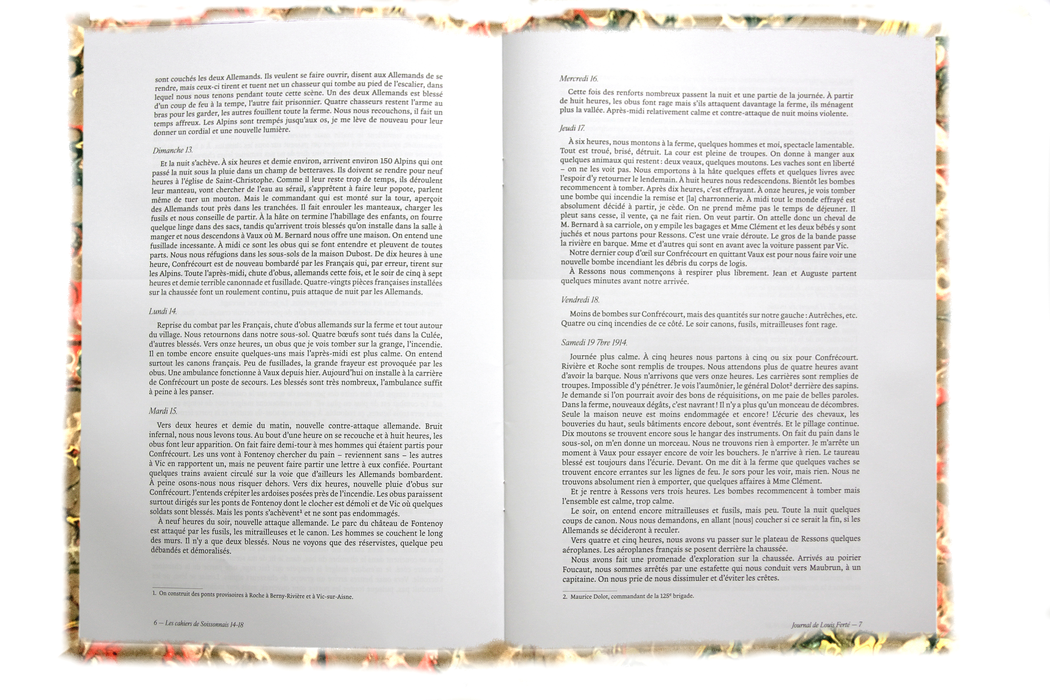 Sous la forme des « cahiers de Soissonnais 14-18 », c’est le témoignage inédit de l’exploitant de la ferme de Confrécourt dès le mois d’août 1914. Il donne un éclairage précis de la réalité des débuts de la Grande Guerre à Confrécourt, la courte occupation allemande, l’arrivée des troupes françaises dans la nuit du 12 au 13 septembre, les premiers morts, les différentes péripéties liées à l’évacuation du lieu…